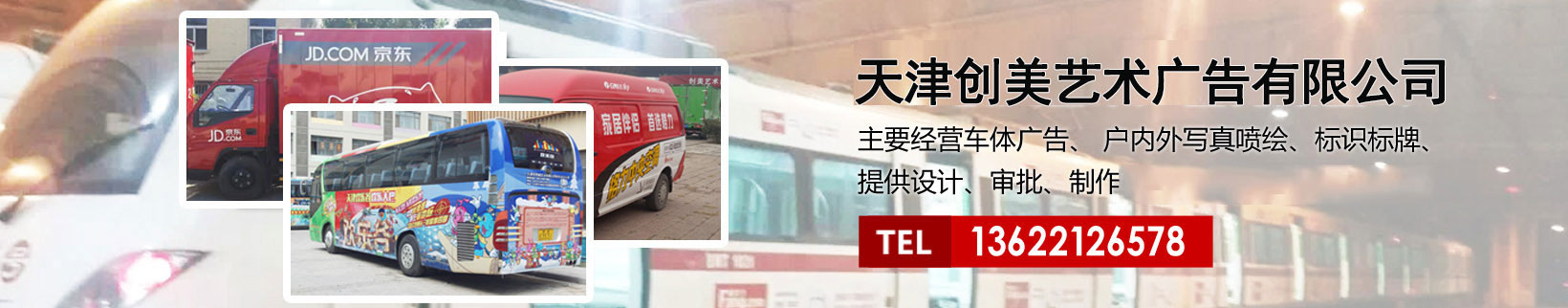 天津創(chuàng)美藝術(shù)廣告有限公司主要經(jīng)營車體廣告、 戶內(nèi)外寫真噴繪、標識標牌、提供設(shè)計、審批、制作、發(fā)布的服務(wù)。